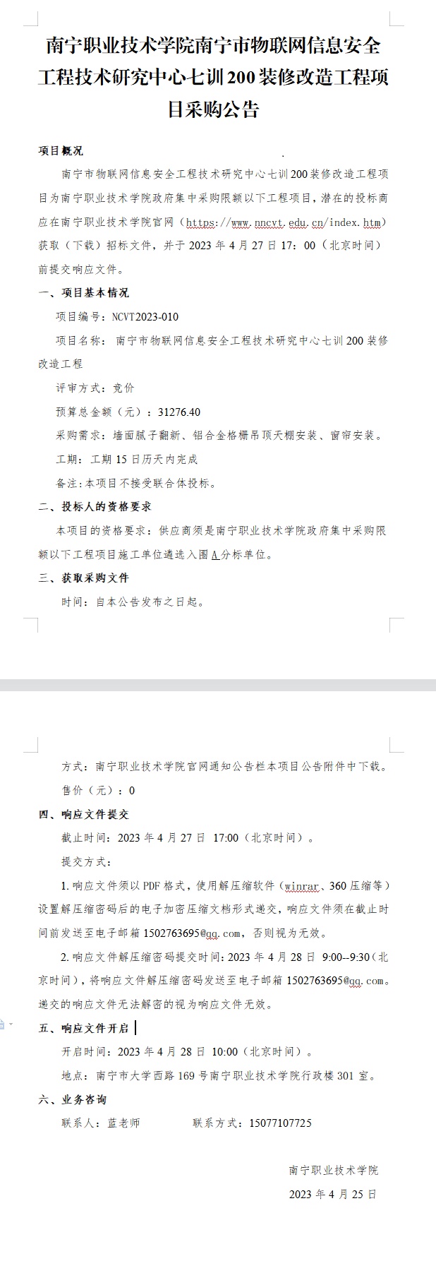 南宁职业技术学院南宁市物联网信息安全工程技术研究中心七训200装修改造工程项目-采购公告