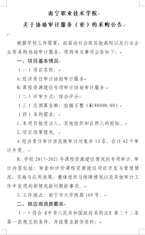 南宁职业技术学院关于协助审计服务(重)的采购公告