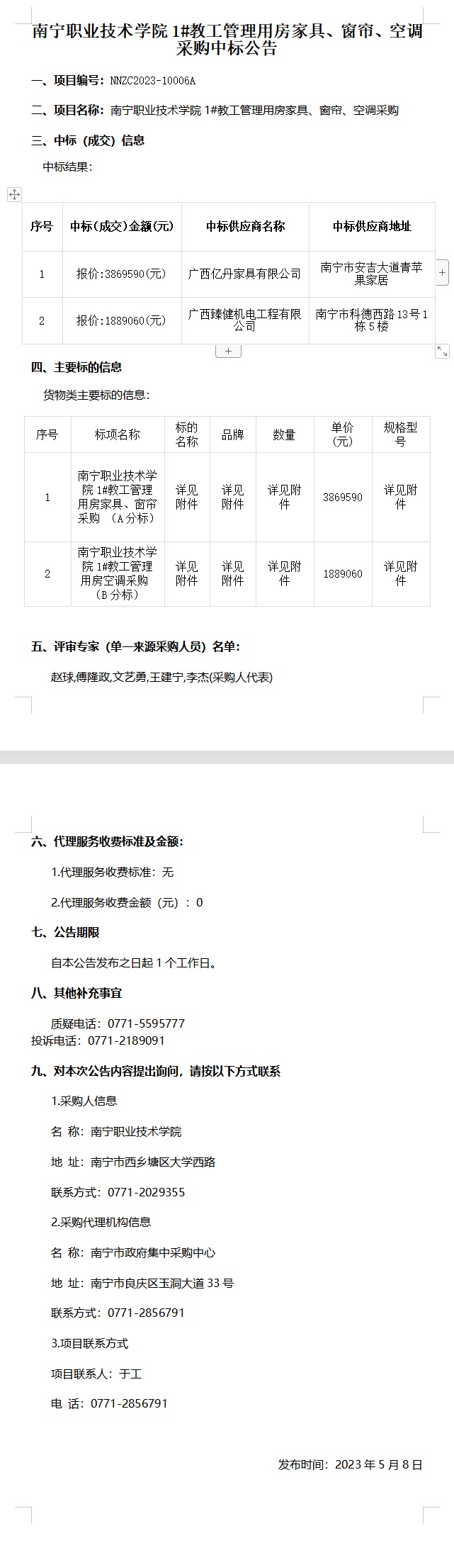 南宁职业技术学院1#教工管理用房家具、窗帘、空调采购-中标公告