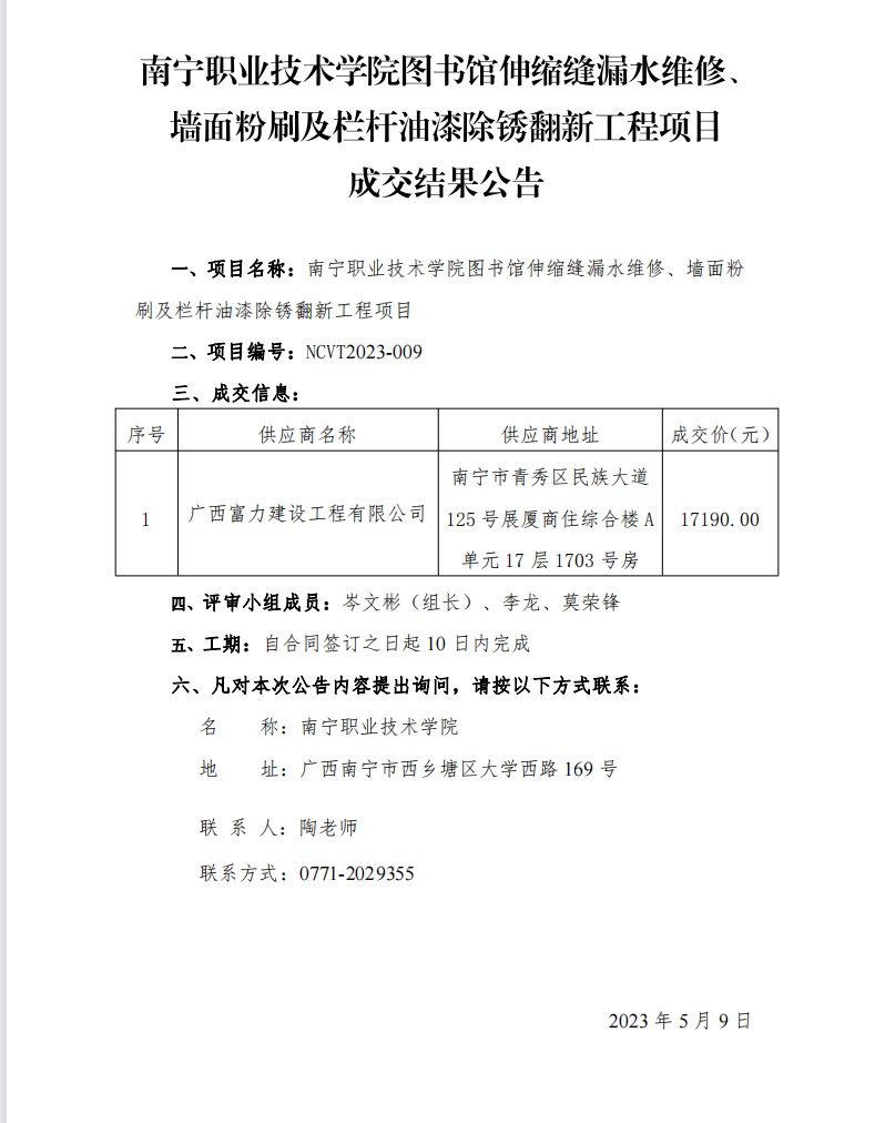 南宁职业技术学院图书馆伸缩缝漏水维修、墙面粉刷及栏杆油漆除锈翻新工程项目-成交结果公告