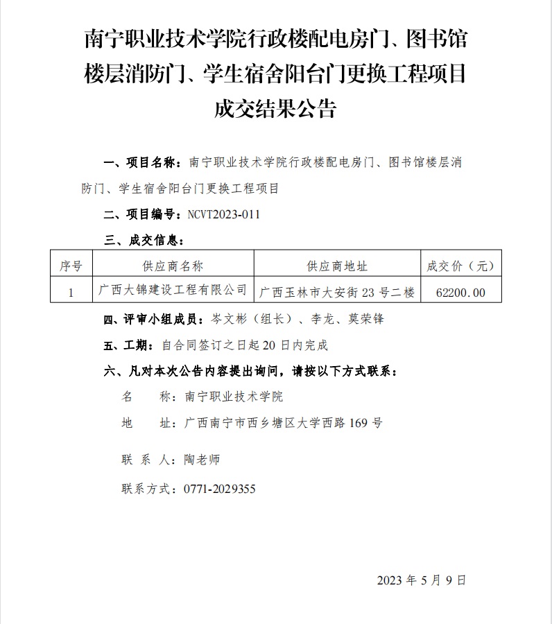 南宁职业技术学院行政楼配电房门、图书馆楼层消防门、学生宿舍阳台门更换工程项目-成交结果公告