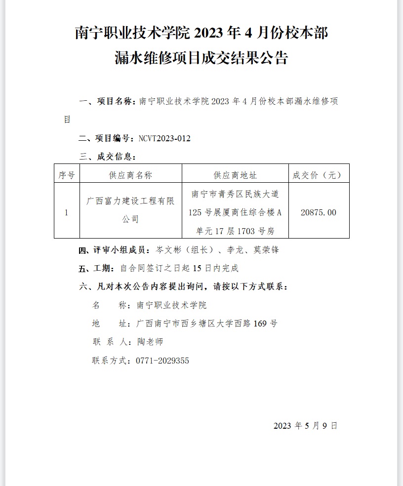 南宁职业技术学院2023年4月份校本部漏水维修项目-成交结果公告
