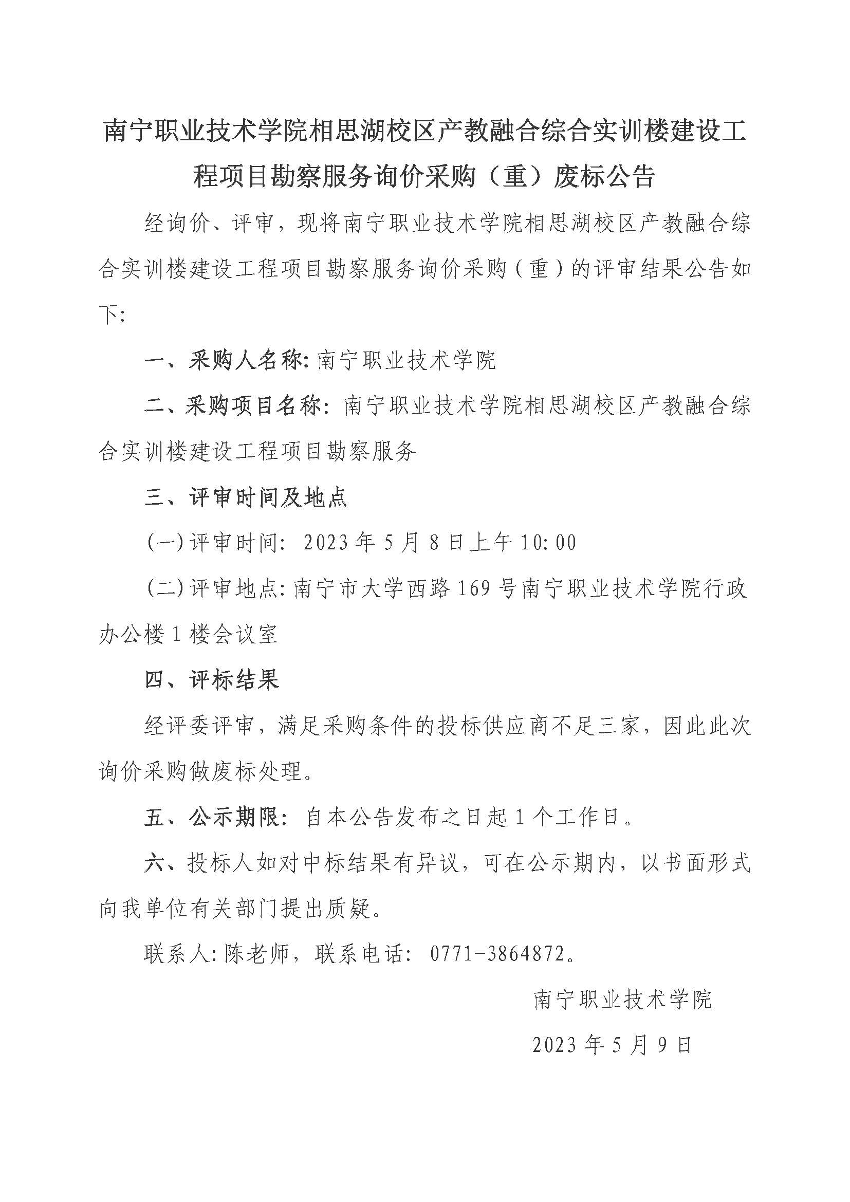 南宁职业技术学院产教融合综合实训楼建设工程项目勘察服务询价采购(重)废标公告