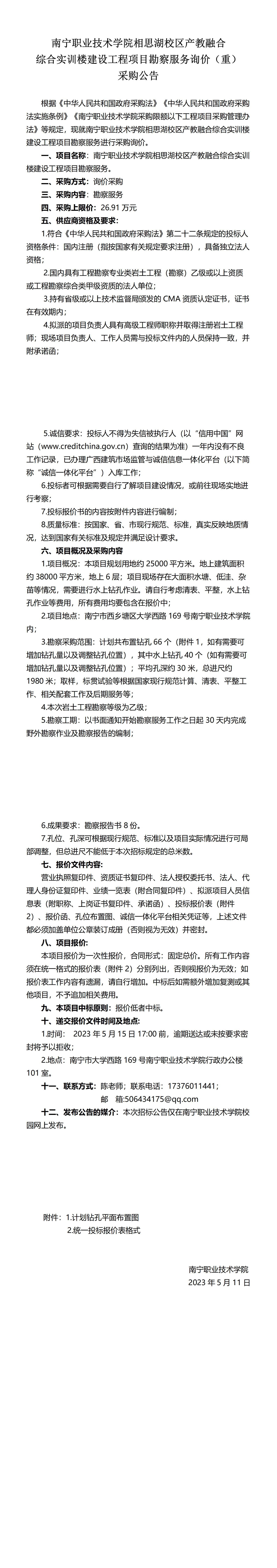 南宁职业技术学院相思湖校区产教融合综合实训楼建设工程项目勘察服务询价(重)采购公告
