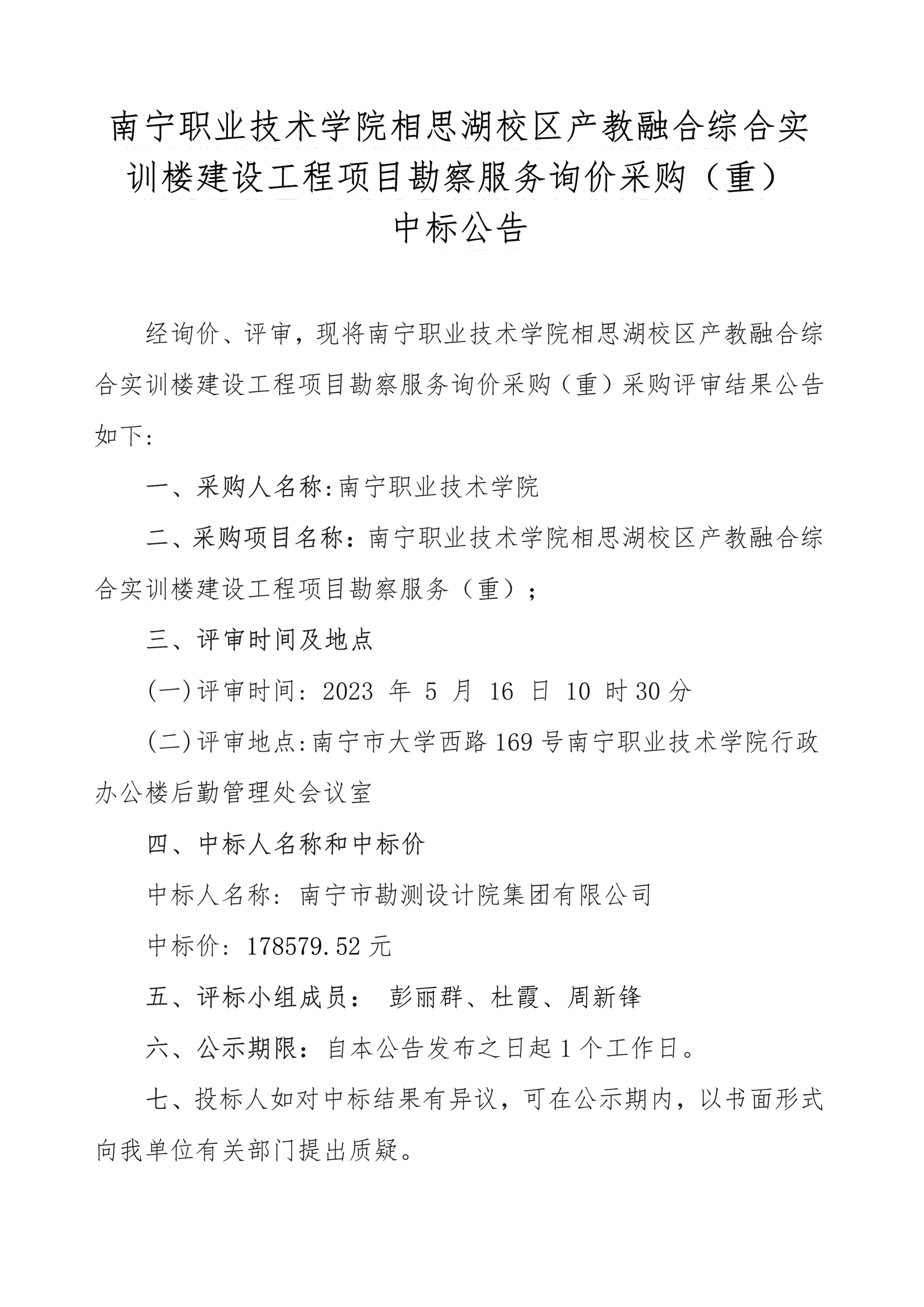 南宁职业技术学院相思湖校区产教融合综合实训楼建设工程项目勘察服务询价采购(重)中标公告