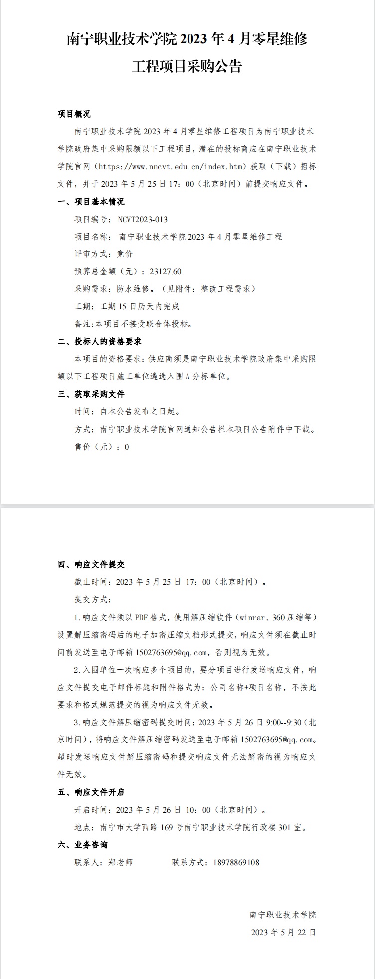 南宁职业技术学院2023年4月零星维修工程项目采购公告