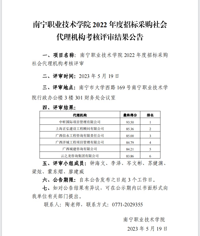 南宁职业技术学院2022年度招标采购社会代理机构考核评审结果公告
