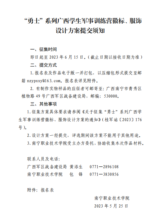 “勇士”系列广西学生军事训练营徽标、服饰设计方案提交须知