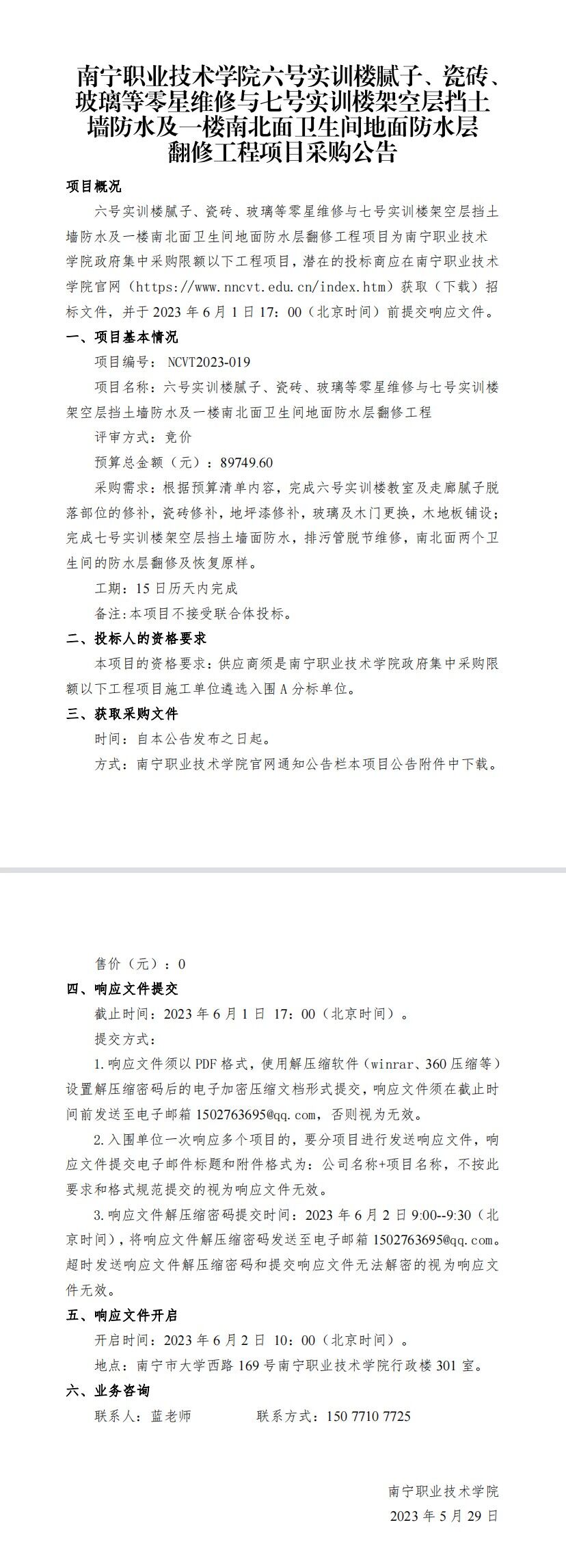 南宁职业技术学院六号实训楼腻子、瓷砖、玻璃等零星维修与七号实训楼架空层挡土墙防水及一楼南北面卫生间地面防水层翻修工程项目采购公告