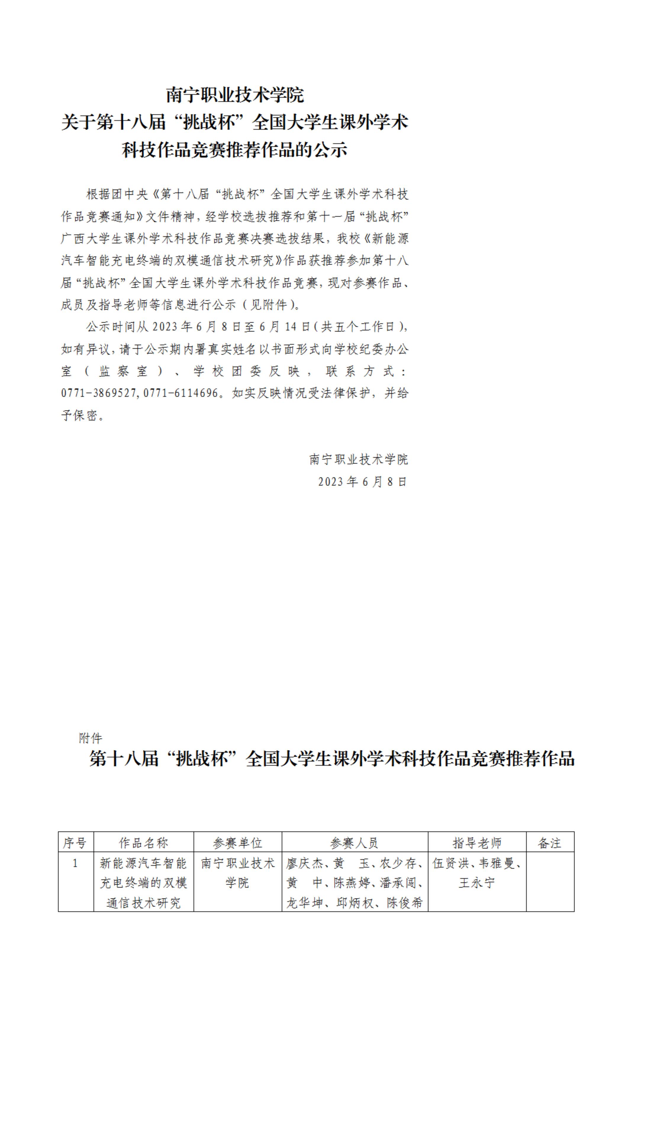 南宁职业技术学院关于第十八届“挑战杯”全国大学生课外学术科技作品竞赛推荐作品的公示