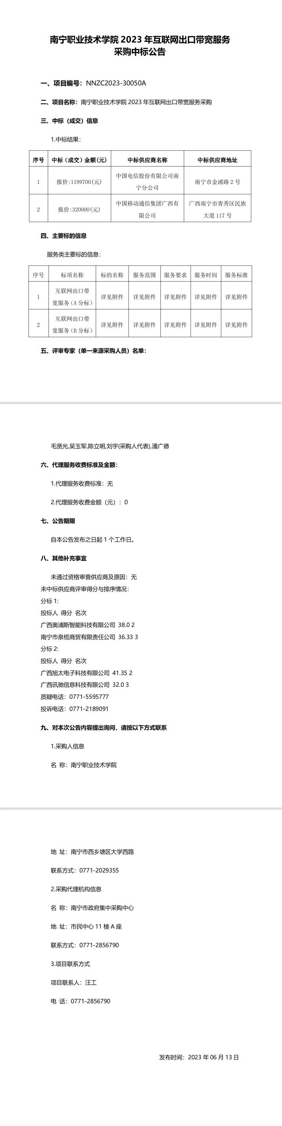 南宁职业技术学院2023年互联网出口带宽服务采购-中标结果公告