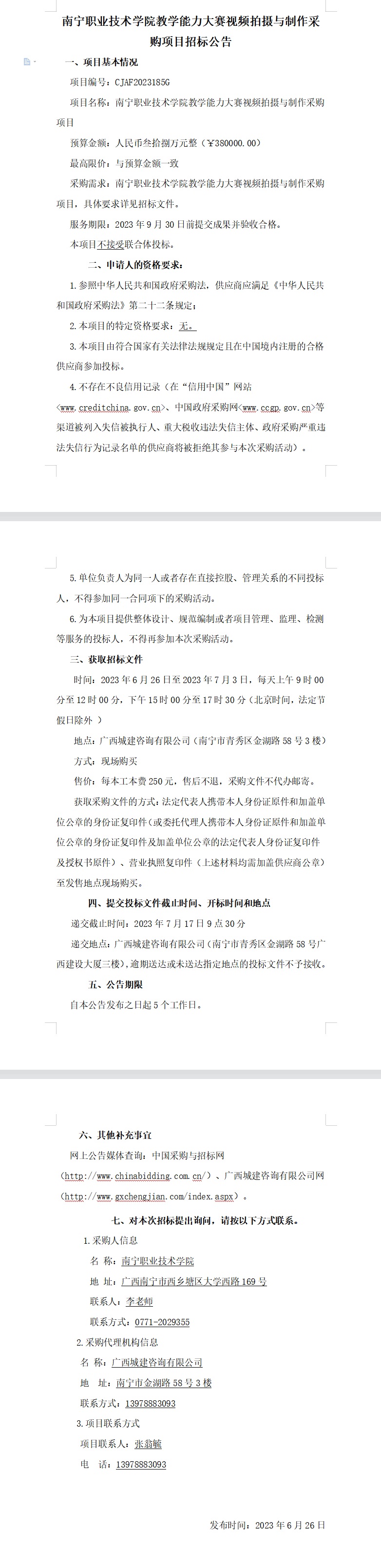 南宁职业技术学院教学能力大赛视频拍摄与制作采购项目招标公告