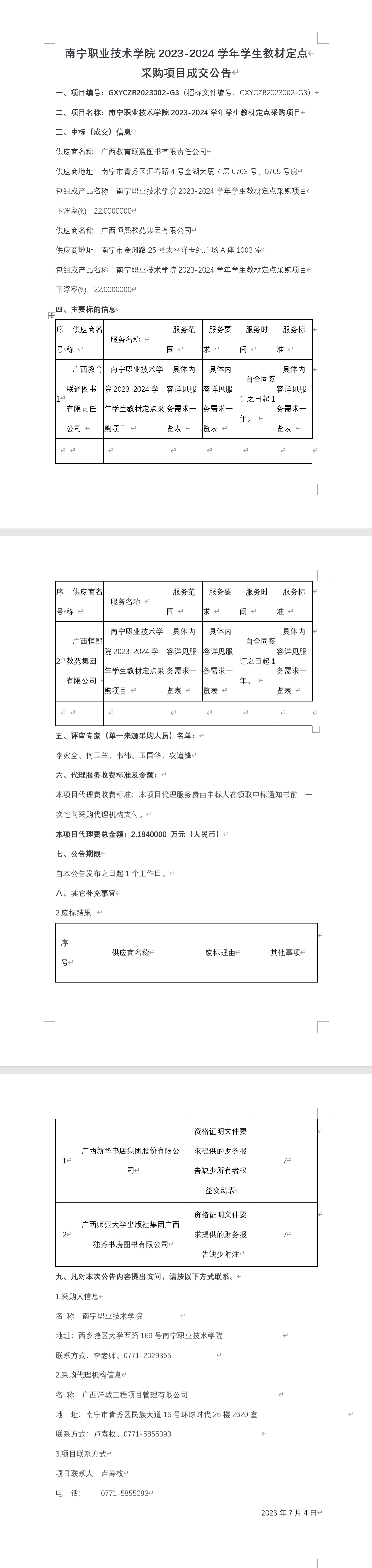 南宁职业技术学院2023-2024学年学生教材定点采购项目成交公告