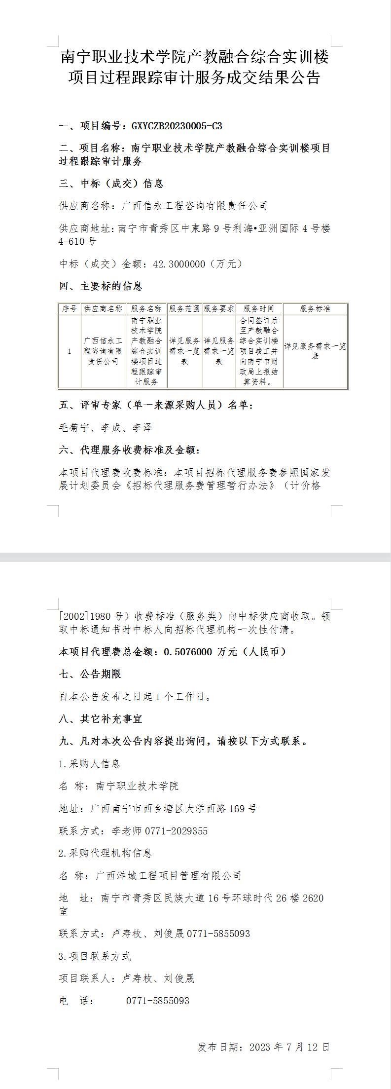 南宁职业技术学院产教融合综合实训楼项目过程跟踪审计服务成交结果公告