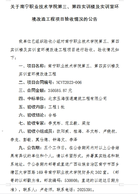 关于南宁职业技术学院第三、第四实训楼及实训室环境改造工程项目验收情况的公告