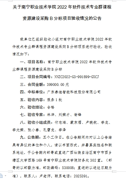 下一条:关于南宁职业技术学院2022年软件技术专业群课程资源建设采购A分标项目验收情况的公告