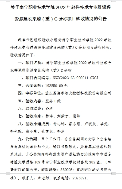 关于南宁职业技术学院2022年软件技术专业群课程资源建设采购(重)C分标项目验收情况的公告