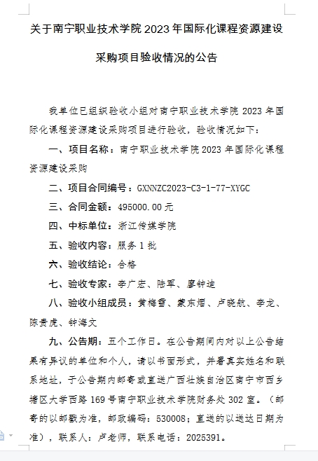 关于南宁职业技术学院2023年国际化课程资源建设采购项目验收情况的公告