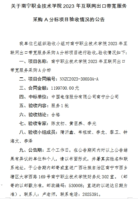 关于南宁职业技术学院2023年互联网出口带宽服务采购A分标项目验收情况的公告