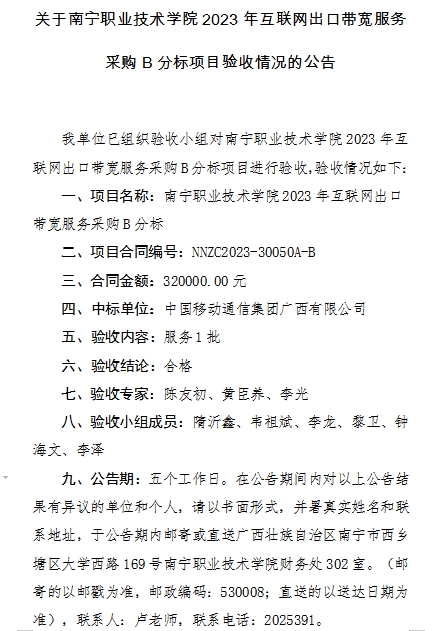 关于南宁职业技术学院2023年互联网出口带宽服务采购B分标项目验收情况的公告
