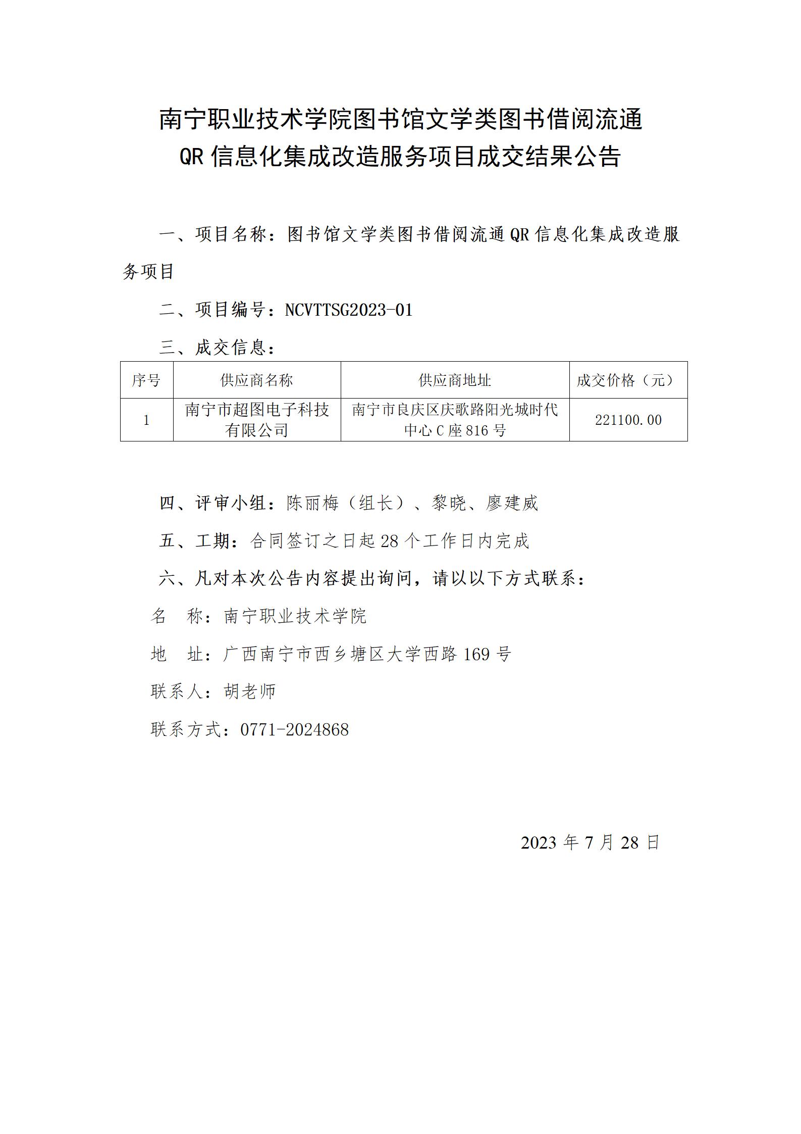 南宁职业技术学院图书馆文学类图书借阅流通QR信息化集成改造服务项目成交结果公告