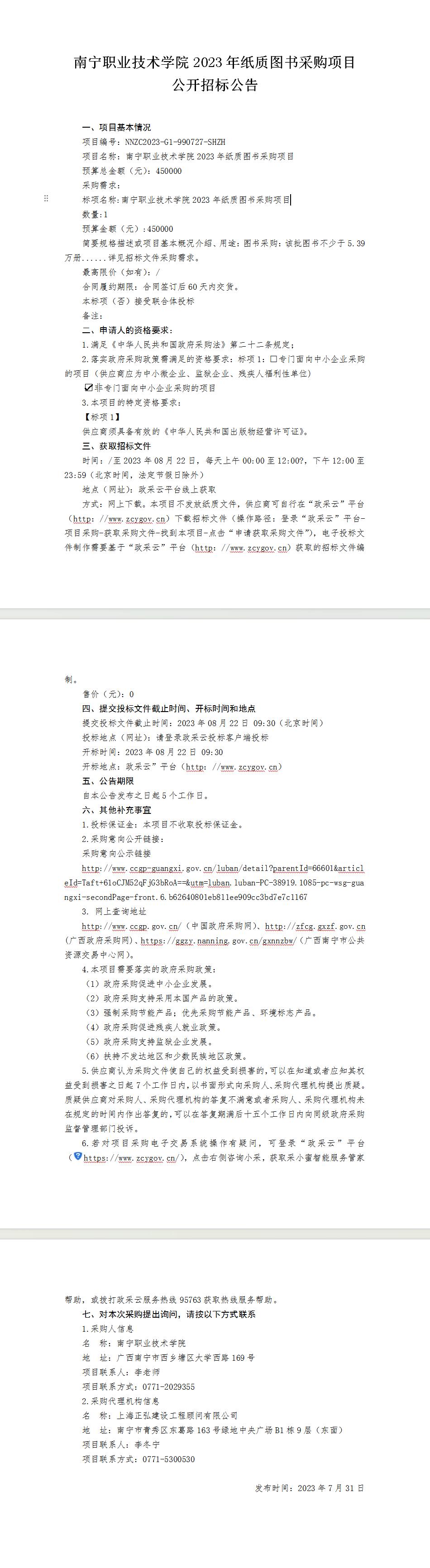 南宁职业技术学院2023年纸质图书采购项目公开招标公告