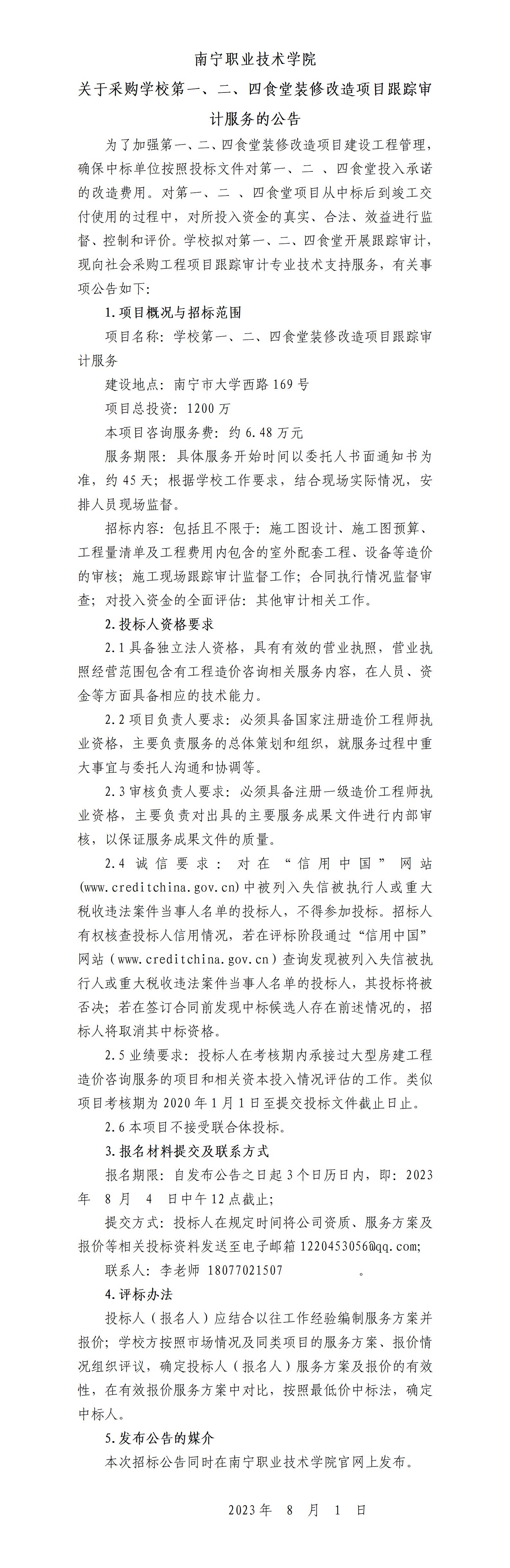 南宁职业技术学院关于采购学校第一、二、四食堂装修改造项目跟踪审计服务的公告