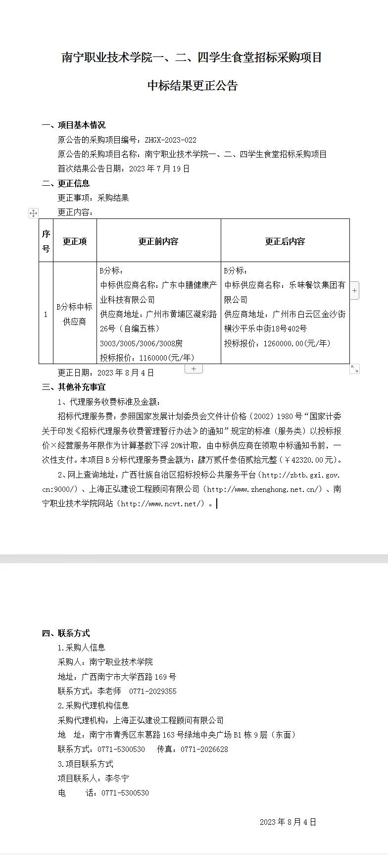 南宁职业技术学院一、二、四学生食堂招标采购项目中标结果更正公告