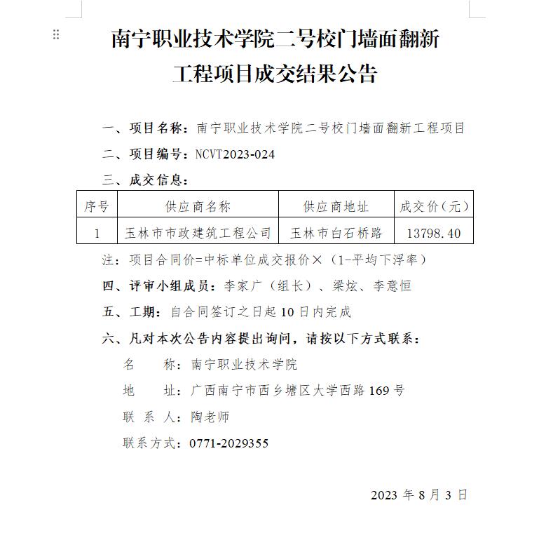 南宁职业技术学院二号校门墙面翻新工程项目成交结果公告