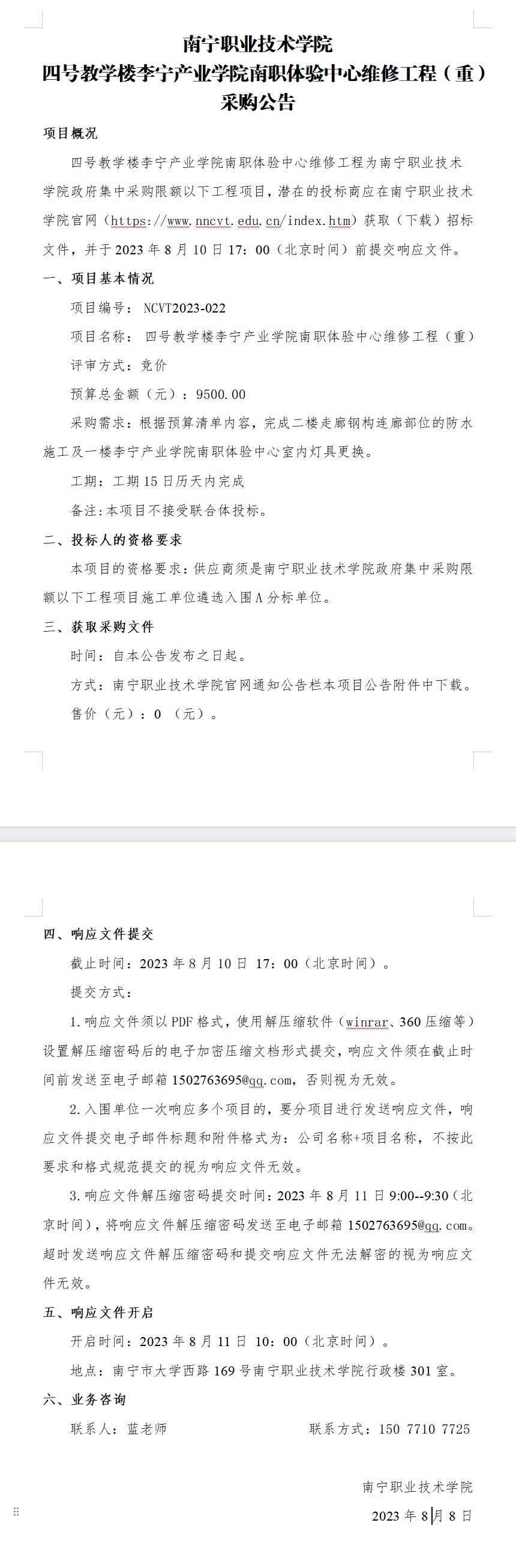 南宁职业技术学院四号教学楼李宁产业学院南职体验中心维修工程采购公告