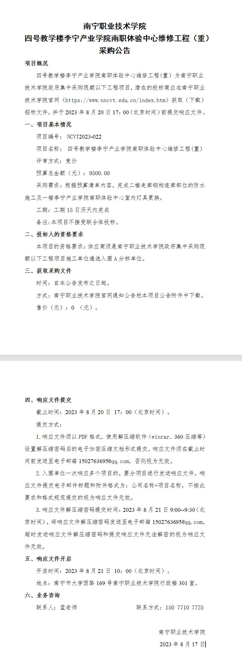 南宁职业技术学院四号教学楼李宁产业学院南职体验中心维修工程(重)采购公告