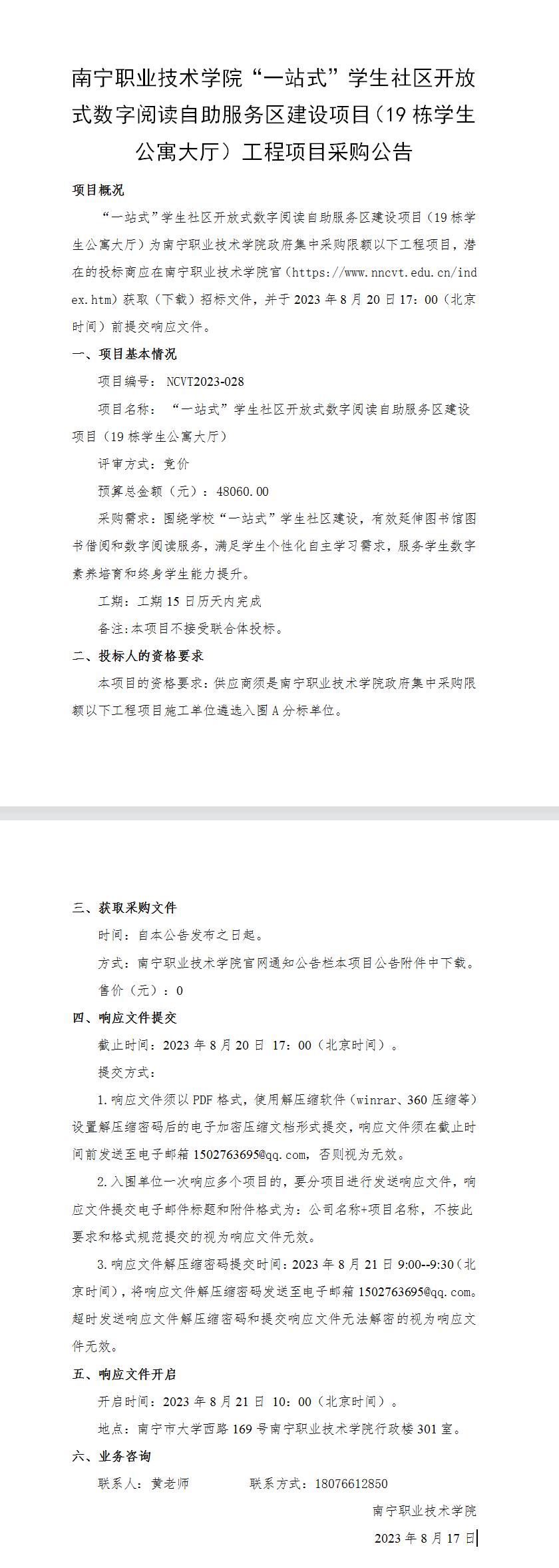 南宁职业技术学院“一站式”学生社区开放式数字阅读自助服务区建设项目(19栋学生公寓大厅)-招标文件.wps