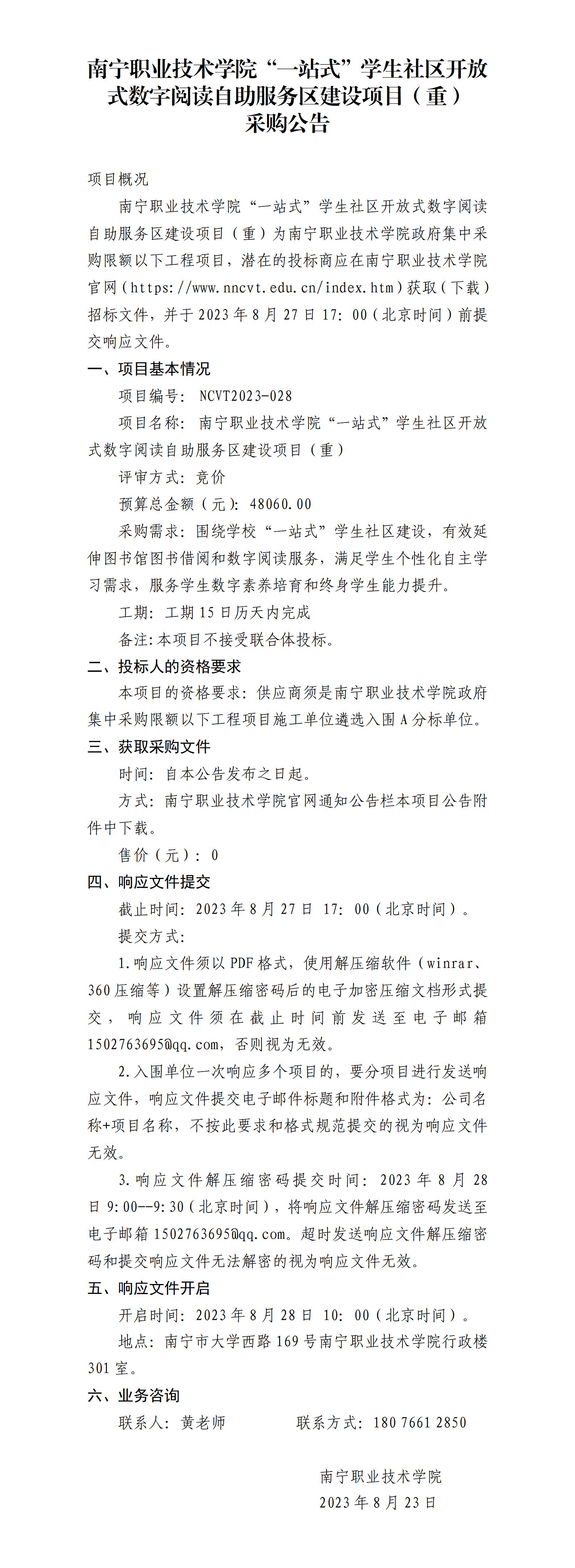 南宁职业技术学院“一站式”学生社区开放式数字阅读自助服务区建设项目(重)采购公告