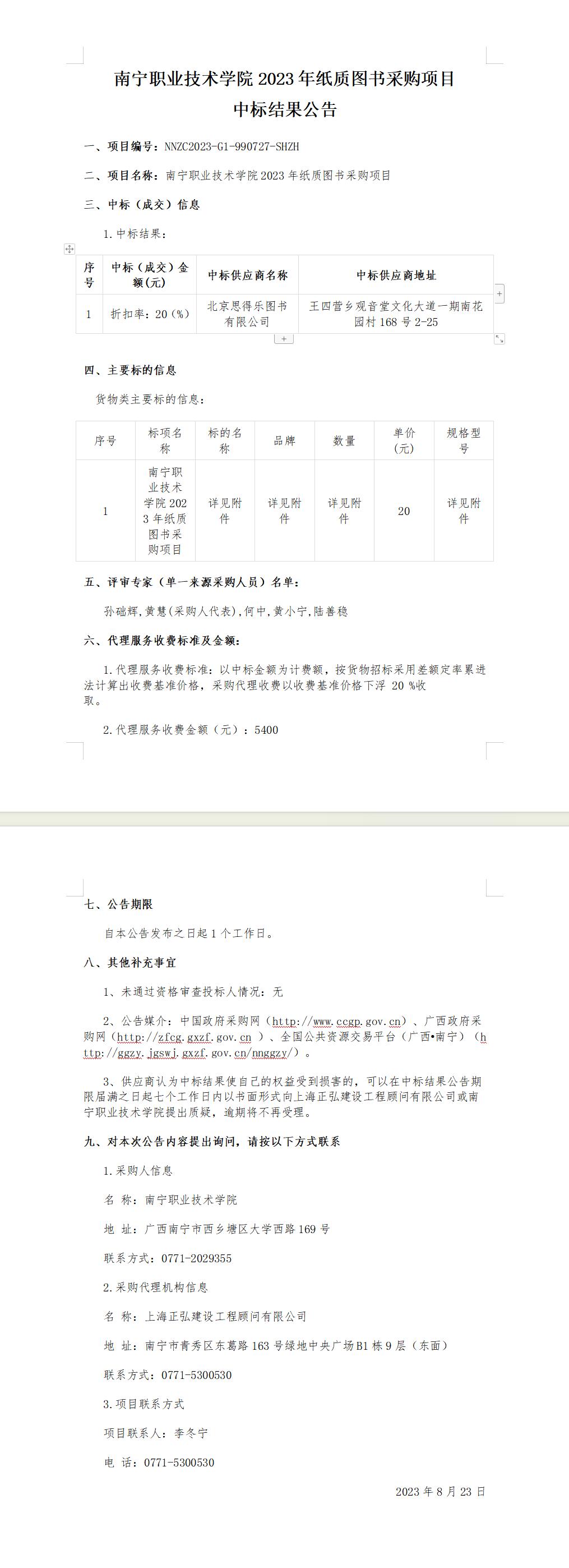 南宁职业技术学院2023年纸质图书采购项目中标结果公告