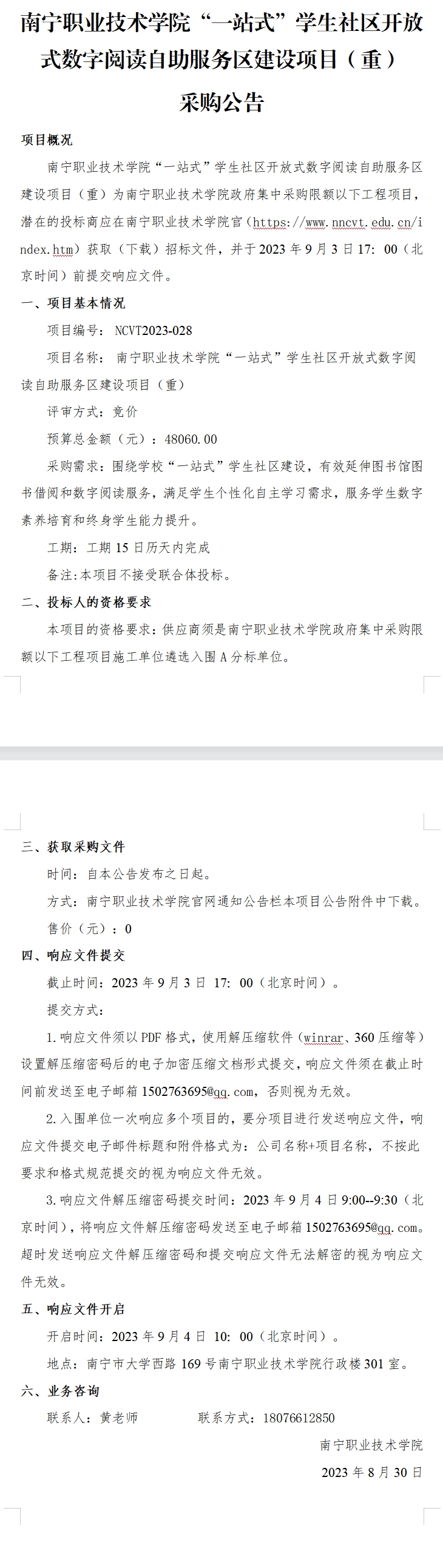 南宁职业技术学院“一站式”学生社区开放式数字阅读自助服务区建设项目(重)采购公告