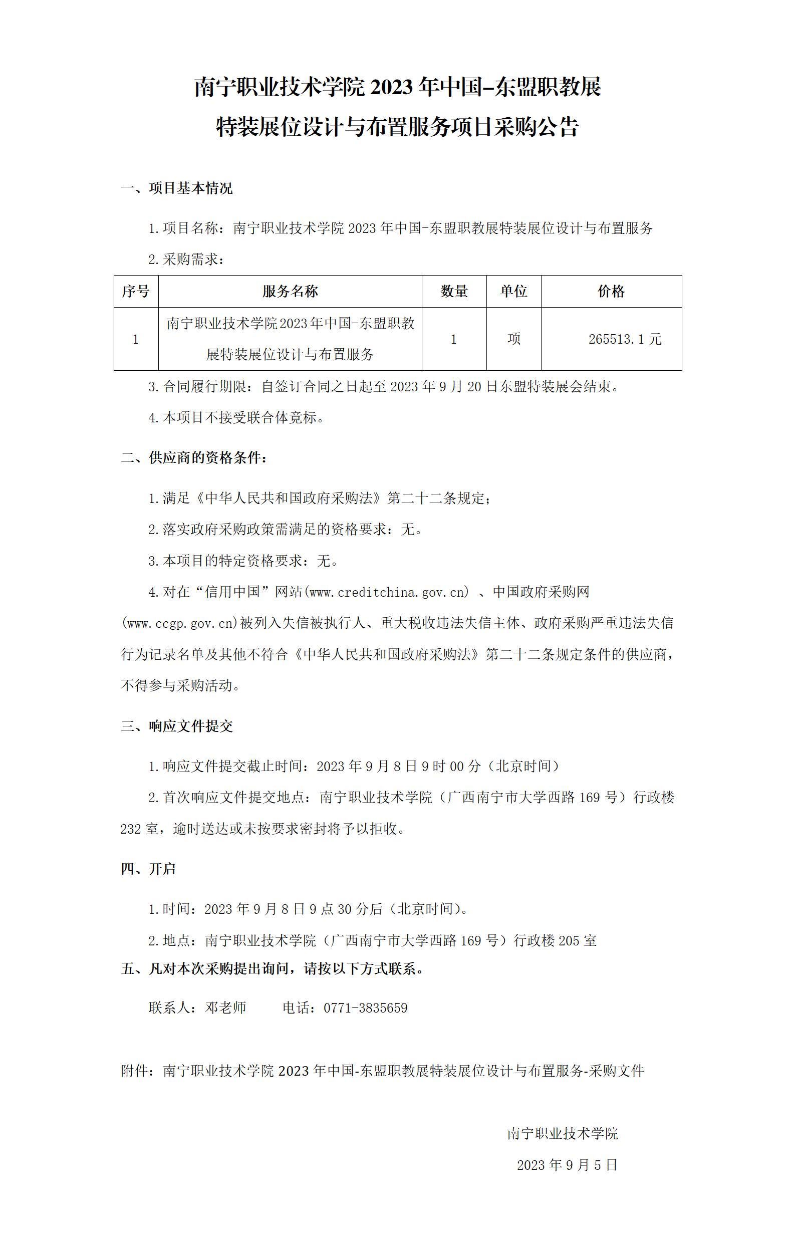 南宁职业技术学院2023年中国——东盟职教展特装展位设计与布置服务项目采购公告