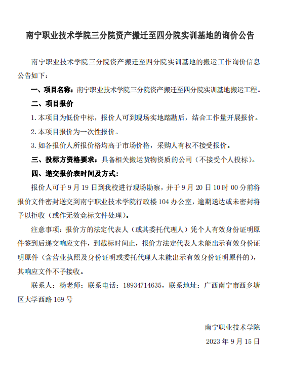 南宁职业技术学院三分院资产搬迁至四分院实训基地的询价公告