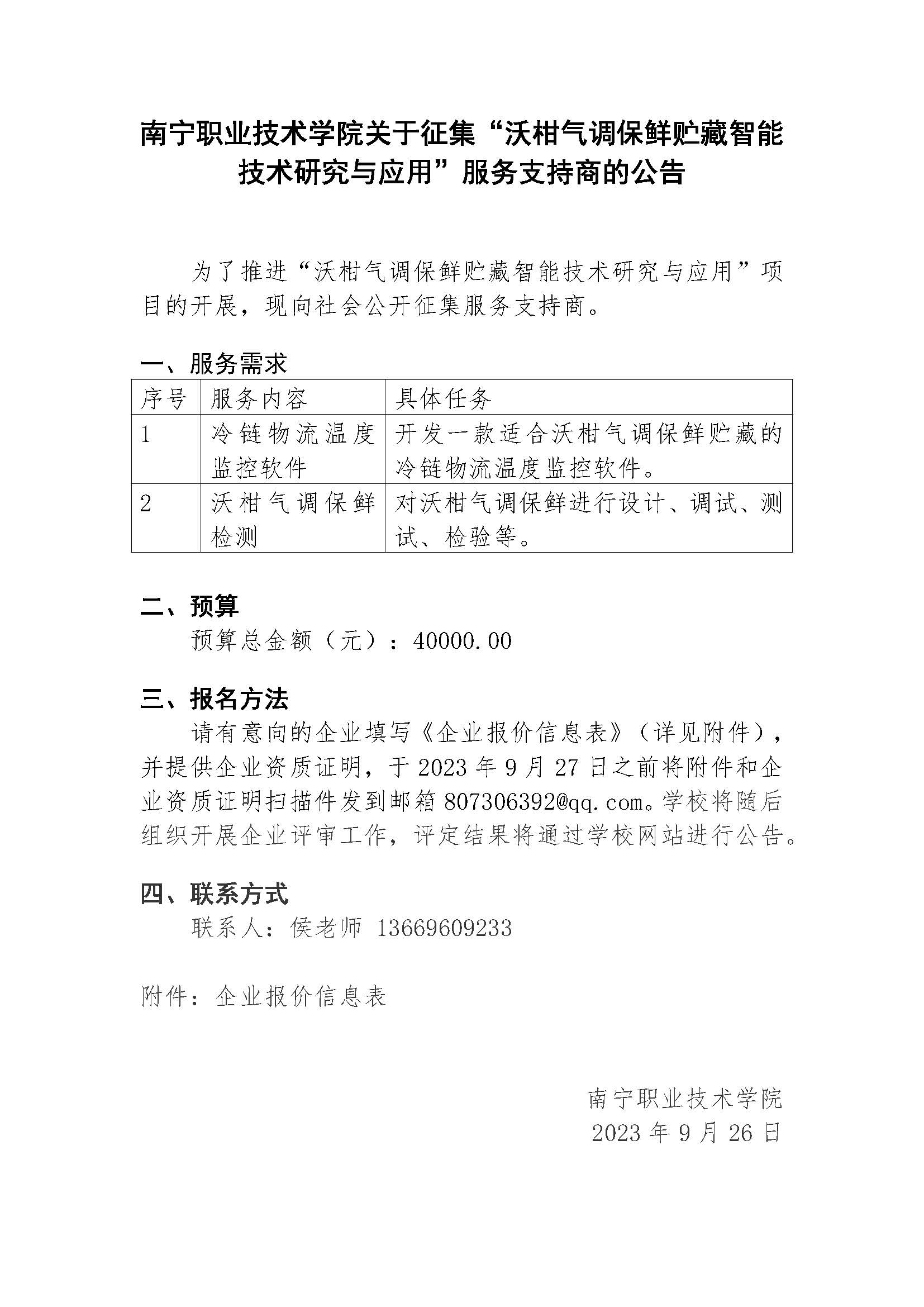 南宁职业技术学院关于征集“沃柑气调保鲜贮藏智能技术研究与应用”服务支持商的公告