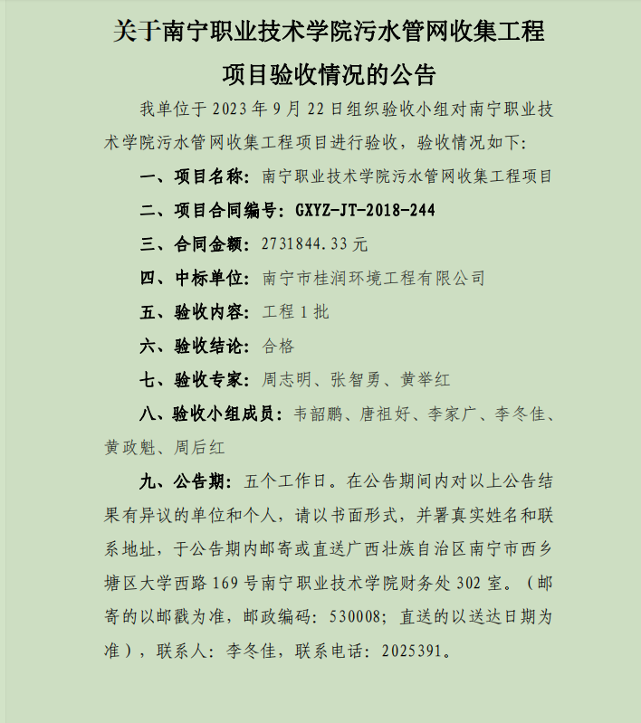 关于南宁职业技术学院污水管网收集工程项目验收情况的公告
