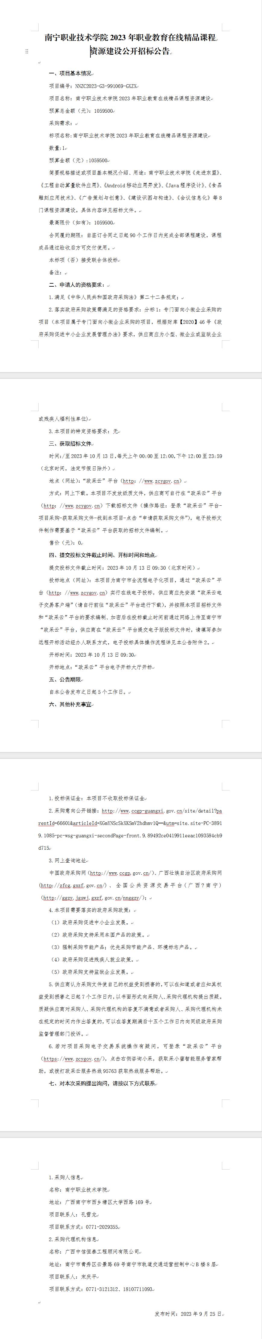 南宁职业技术学院2023年职业教育在线精品课程资源建设公开招标公告