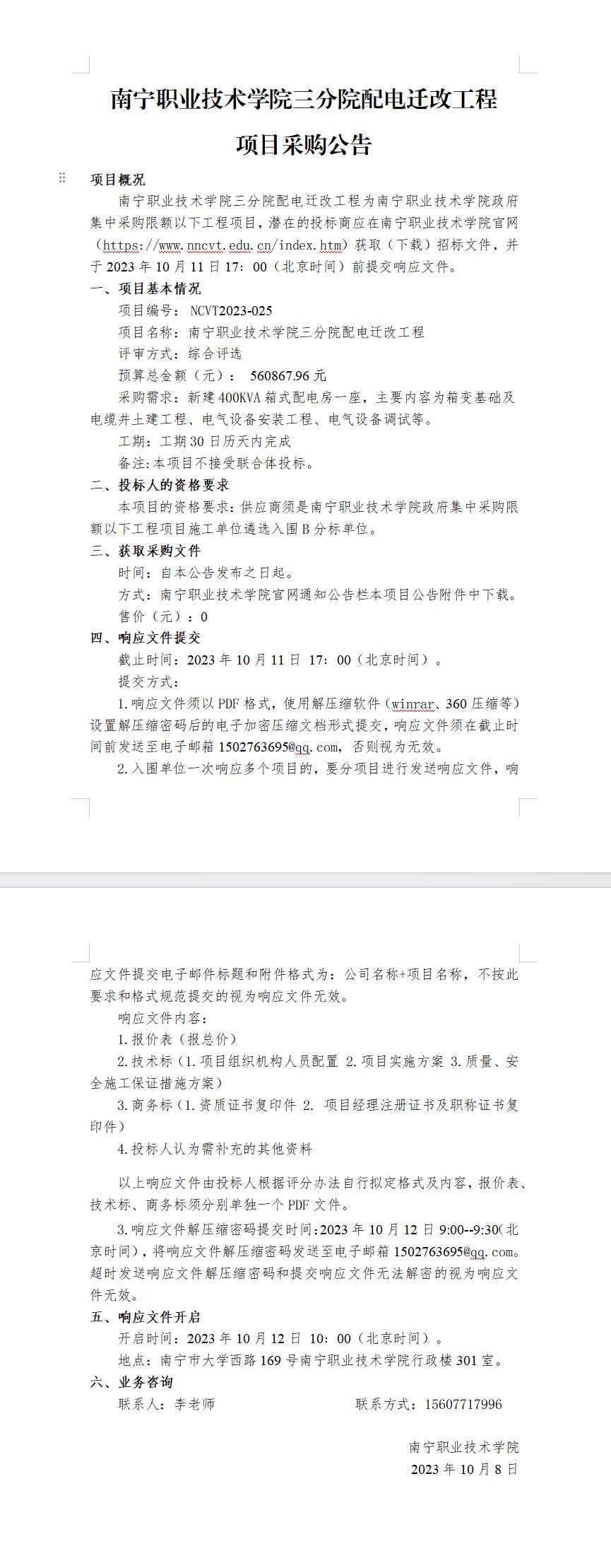 南宁职业技术学院三分院配电迁改工程项目采购公告