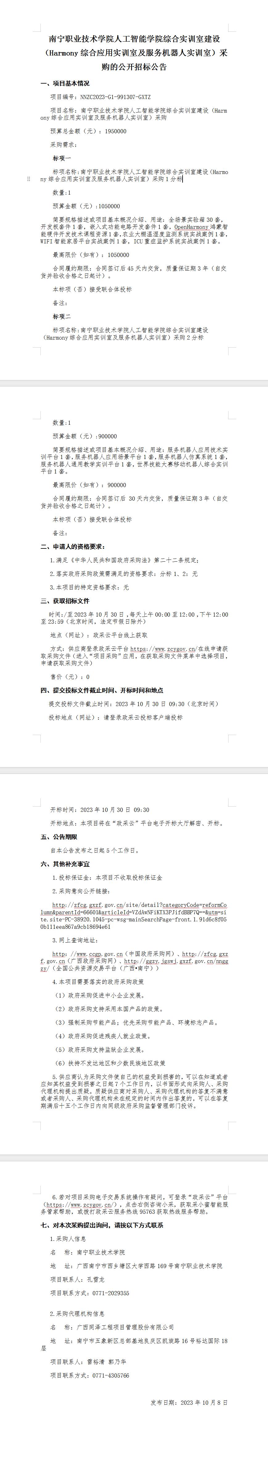 南宁职业技术学院人工智能学院综合实训室建设(Harmony综合应用实训室及服务机器人实训室)采购公开招标公告