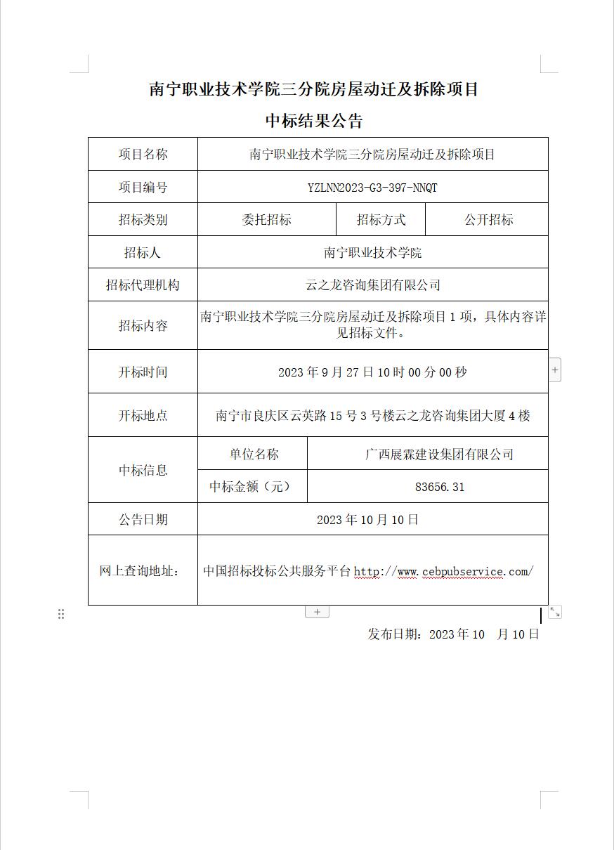 南宁职业技术学院三分院房屋动迁及拆除项目中标结果公告