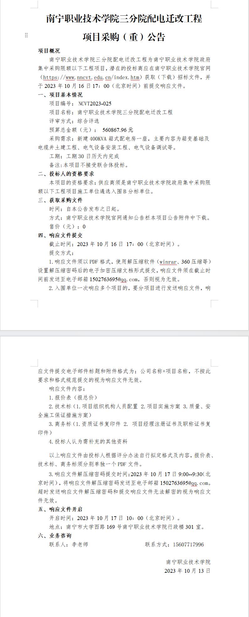 南宁职业技术学院三分院配电迁改工程(重)公告