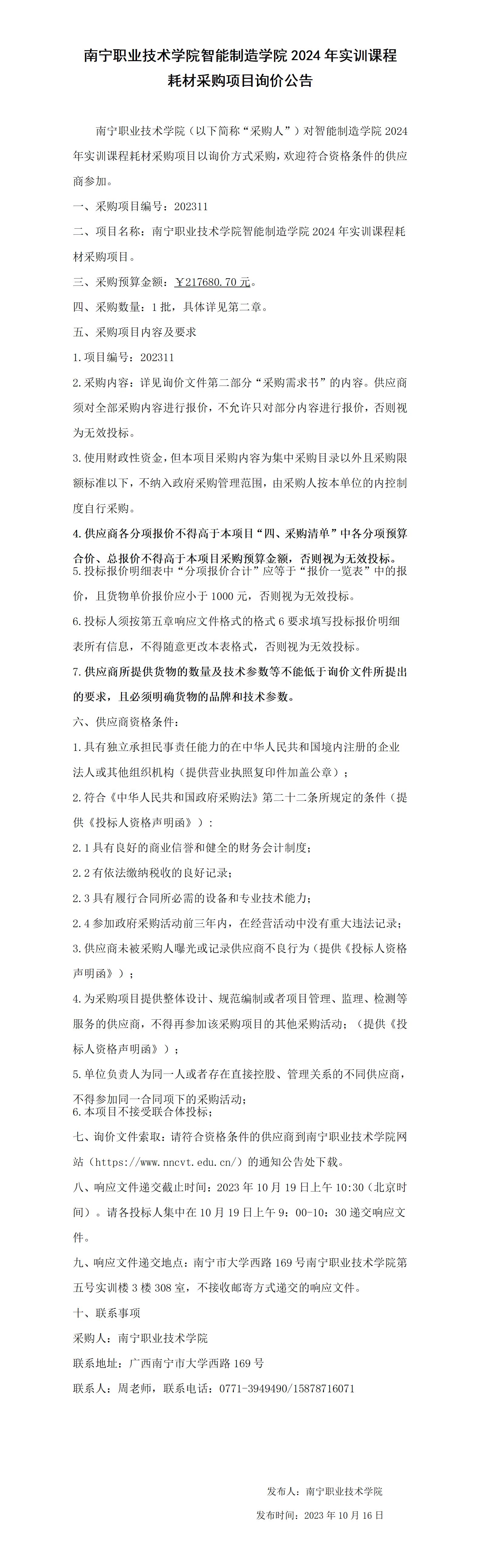 南宁职业技术学院智能制造学院2024年实训课程耗材采购项目询价公告
