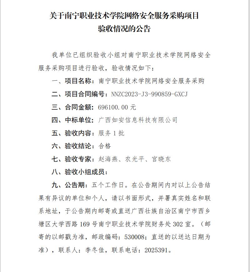 关于南宁职业技术学院网络安全服务采购项目验收情况的公告