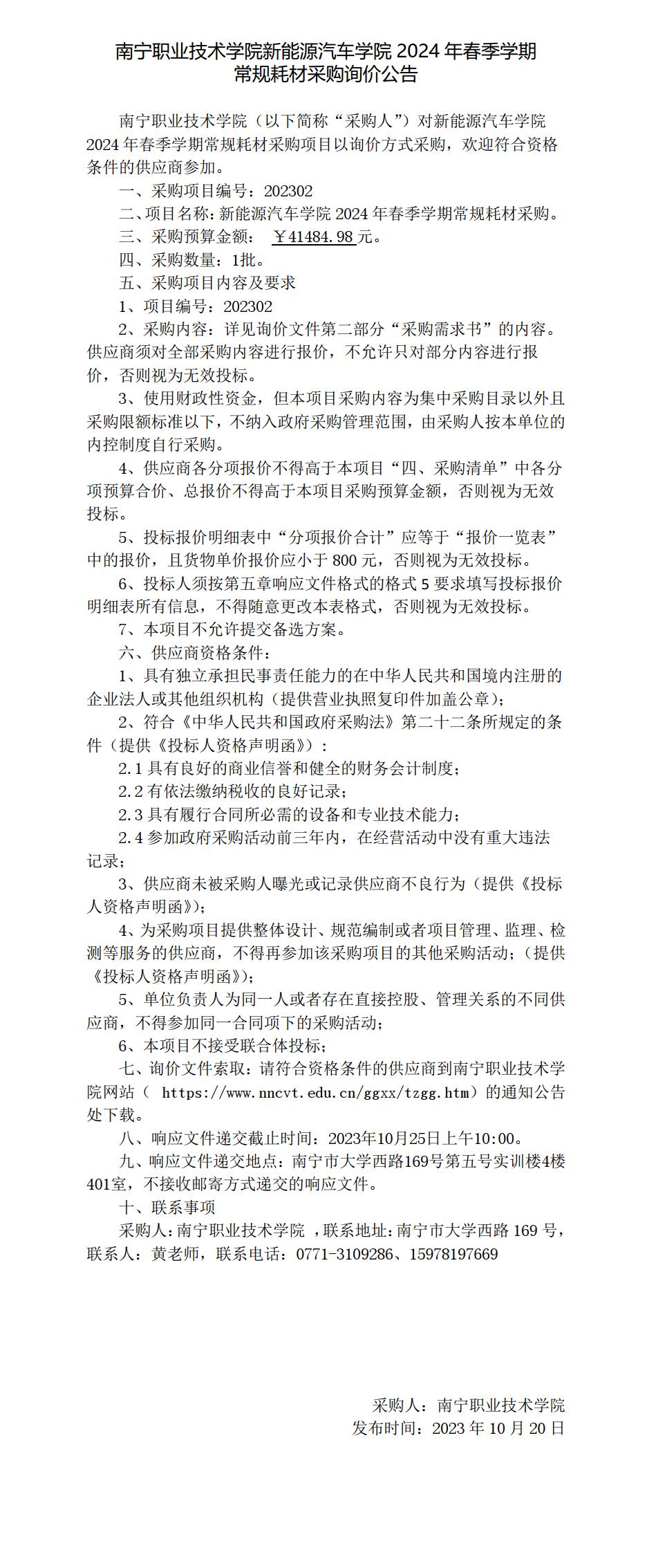 南宁职业技术学院新能源汽车学院2024年春季学期常规耗材采购询价公告