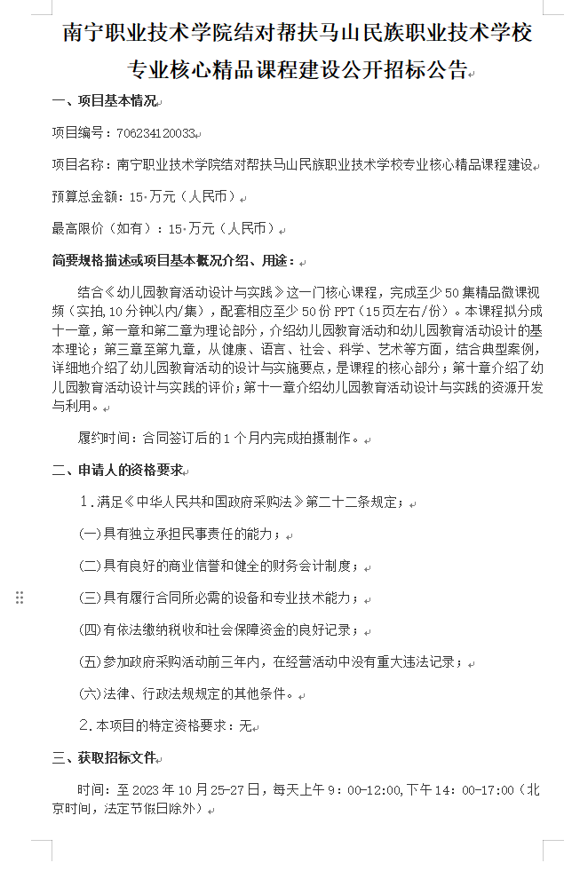 南宁职业技术学院结对帮扶马山民族职业技术学校专业核心精品课程建设公开招标公告
