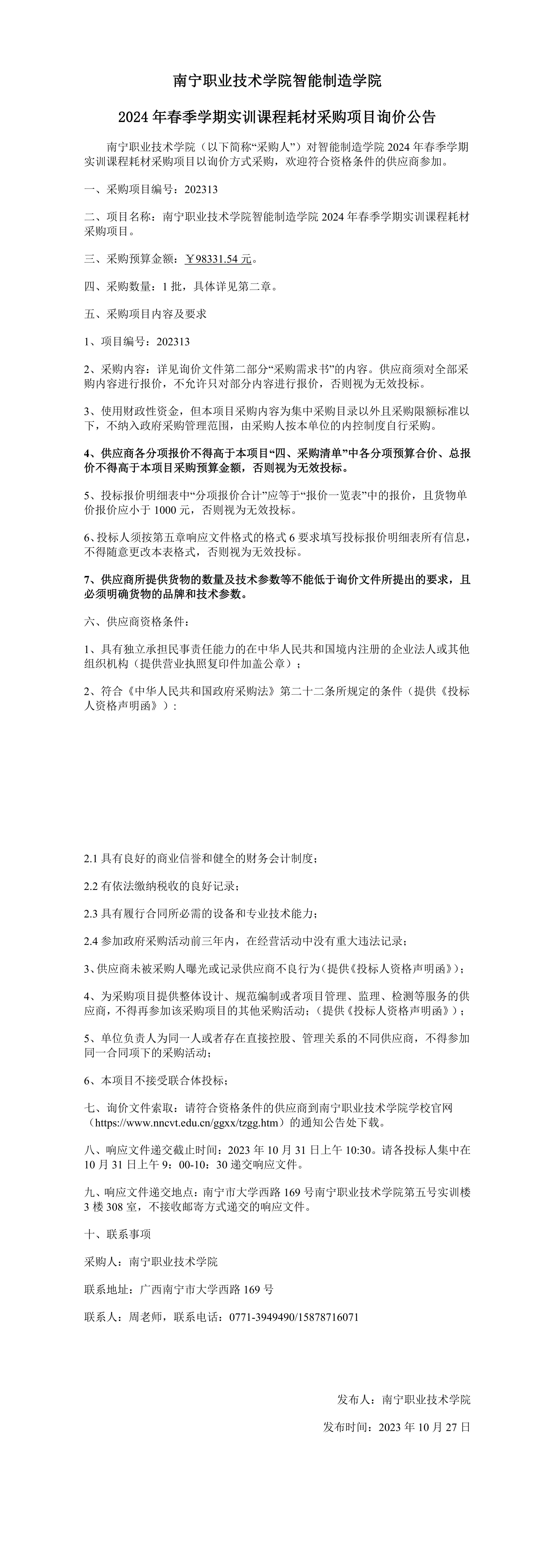 南宁职业技术学院智能制造学院2024年春季学期实训课程耗材采购项目询价公告