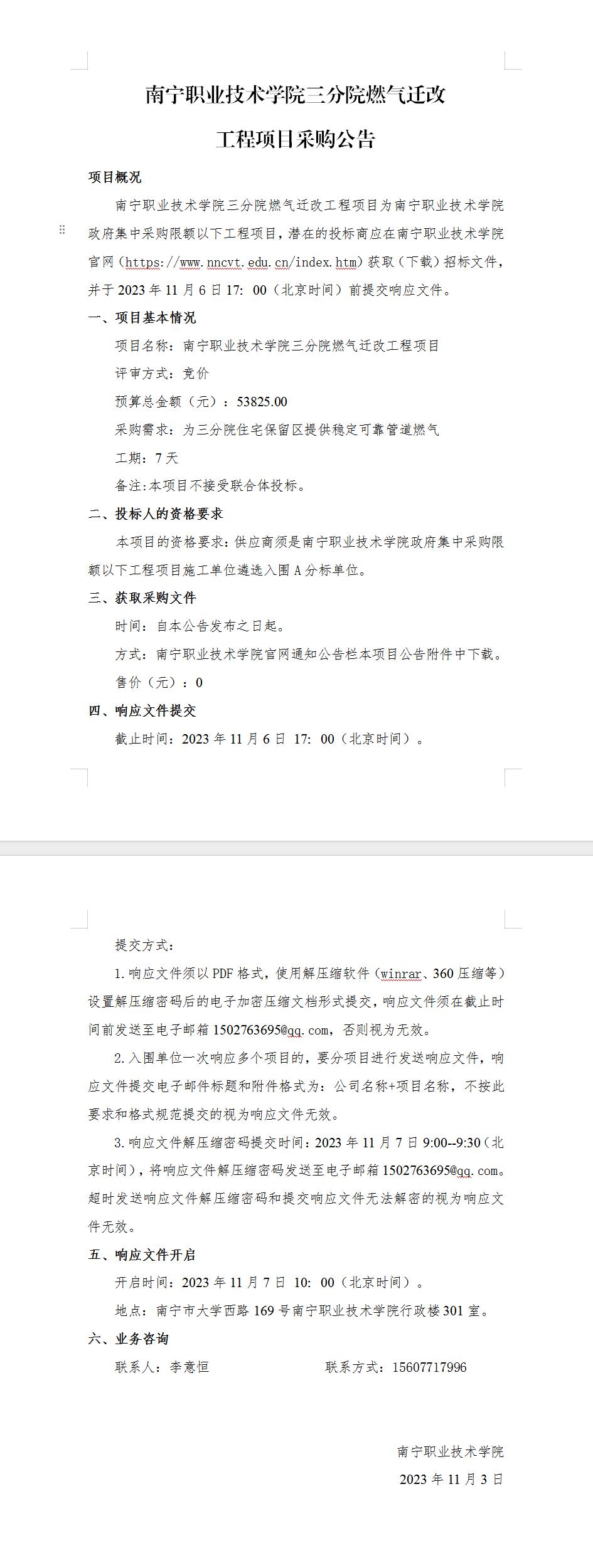 南宁职业技术学院三分院燃气迁改工程项目采购公告